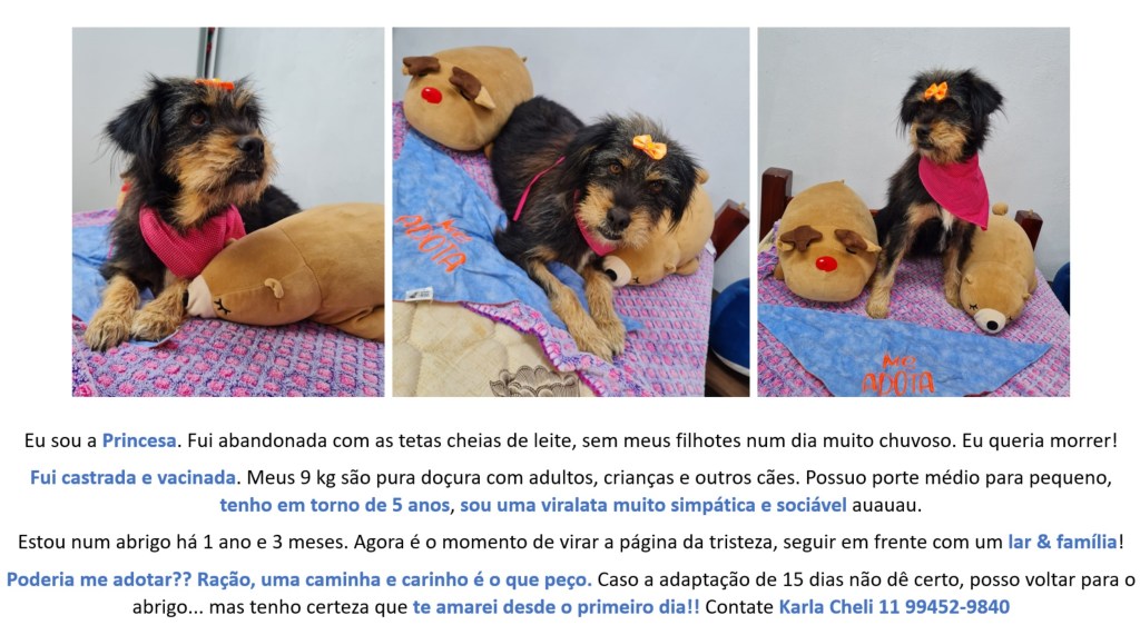 | Fui abandonada com as tetas cheias de leite, sem meus filhotes num dia muito chuvoso. Eu queria morrer! Fui castrada, vermifugada e vacinada. Possuo porte médio para pequeno, tenho em torno de 5 anos, sou uma viralata muito simpática e sociável auauau. Estou num abrigo há 1 ano e 3 meses. Gostaria de um lar… Poderia me adotar?? Caso a adaptação de 15 dias não dê certo, posso voltar para o abrigo… mas tenho certeza que te amarei desde o primeiro dia!! CONTATE O TELEFONE DA IMAGEM PARA MAIS INFORMAÇÕES |